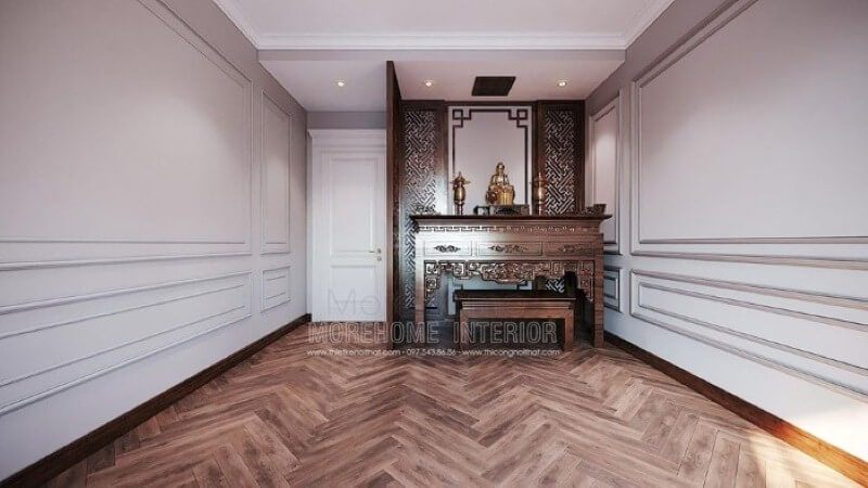 Tủ thờ kết hợp vách ngăn gỗ đẹp tạo nét trang trọng cho phòng thờ chung cư, biệt thự, nhà phố.