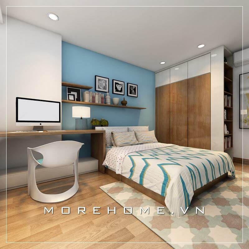 Mẫu thiết kế nội thất phòng ngủ chung cư đơn giản, hiện đại, chiếc bàn làm việc được kê sát giường ngủ mang đến sự thoải mái và tiện dụng hơn cho gia chủ