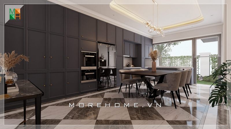 KTS Morehome đã sáng tạo ra một phương án để tận dụng khoảng không gian trống giữa phòng khách và lối vào bằng cách đặt một bộ bàn ăn. Điều này sẽ giúp không gian trống trải và tạo nên một bố cục ấm áp cho ngôi nhà của bạn.