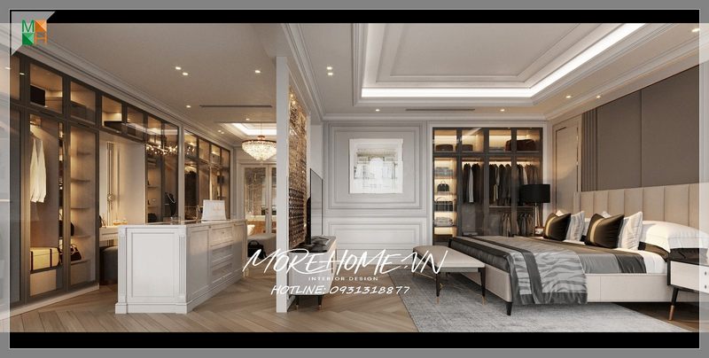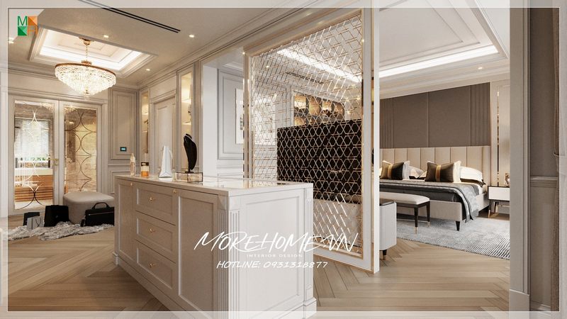 Đèn ngoài công dụng chiếu sáng, chiếc đèn còn đóng vai trò như 1 món đồ trang trí giúp không gian phòng ngủ có đảo phòng thay đồ thêm sáng và nổi bật hơn.