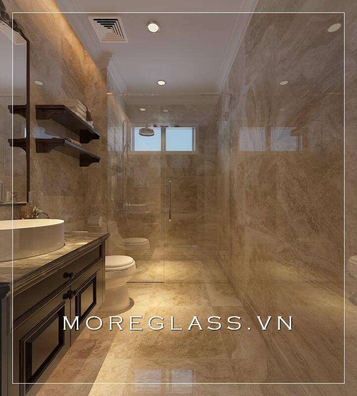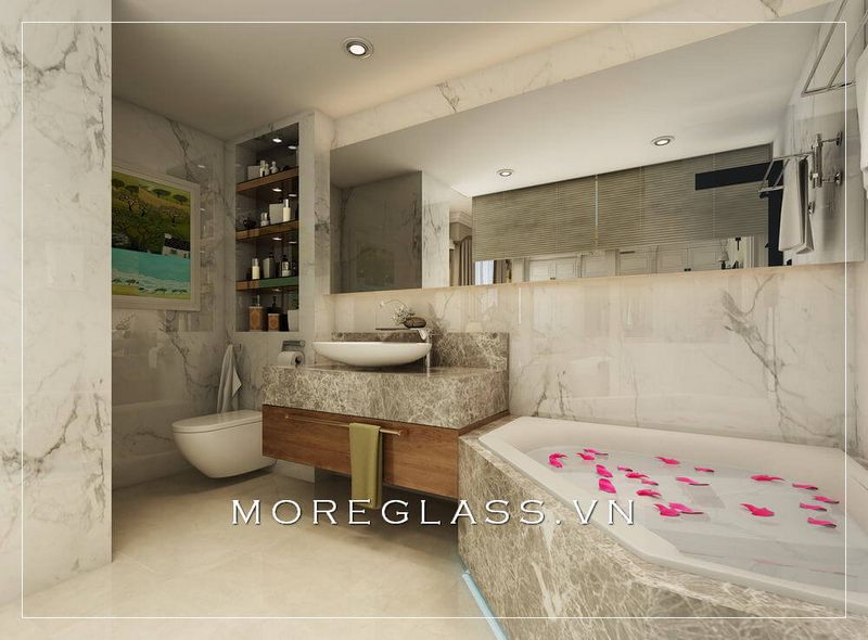 Sự kết hợp độc đáo của đá tự nhiên ốp bồn tắm, mặt bàn kệ lavabo cao cấp với màu nâu vàng và vân loang trắng góp phần tạo nên vẻ đẹp sang trọng và tinh tế cho không gian căn phòng.