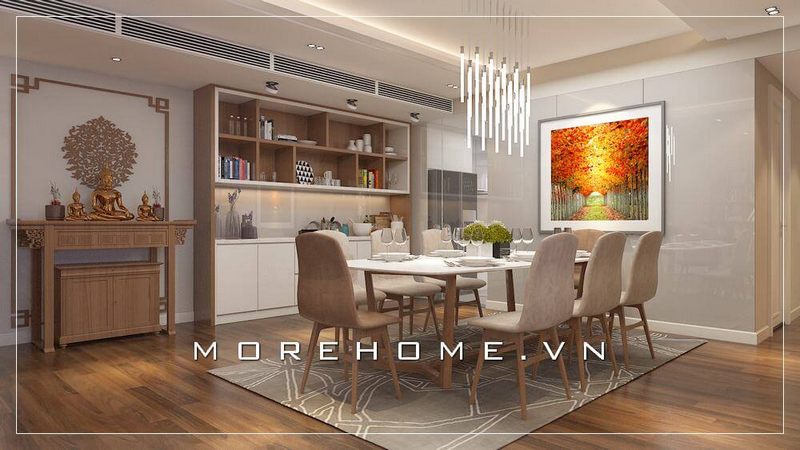 Nội thất phòng thờ trong căn hộ được thiết kế với sự trang nghiêm, kết hợp gỗ nội thất tự nhiên với gam màu gỗ cổ điển.